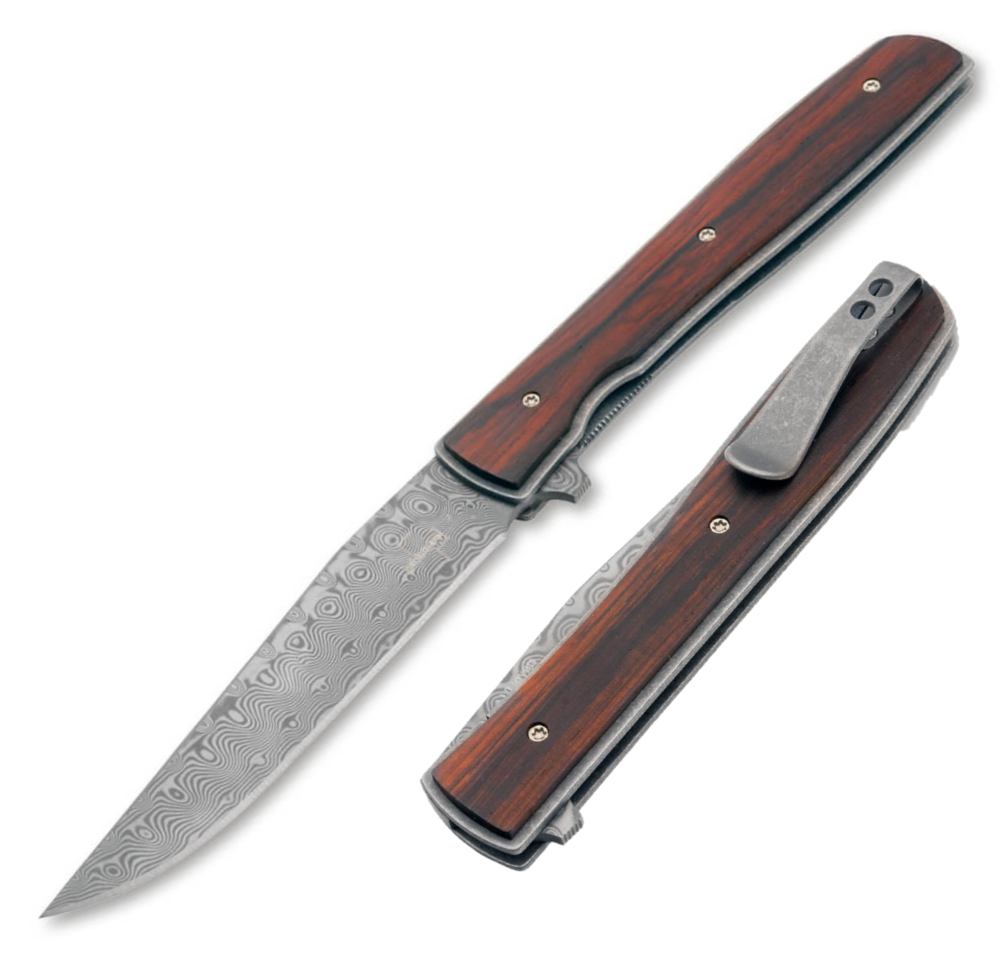 Böker Plus Urban Trapper Cocobolo Damascus är en modern ikon och den ultimata gentlemannakniven för den stilmedvetne användaren. Designad av Brad Zinker, kombinerar denna exklusiva utgåva en extremt lätt och slimmad profil med de mest eleganta material man kan tänka sig. Det är en fällkniv som utstrålar sofistikerad minimalism och teknisk perfektion i varje detalj.